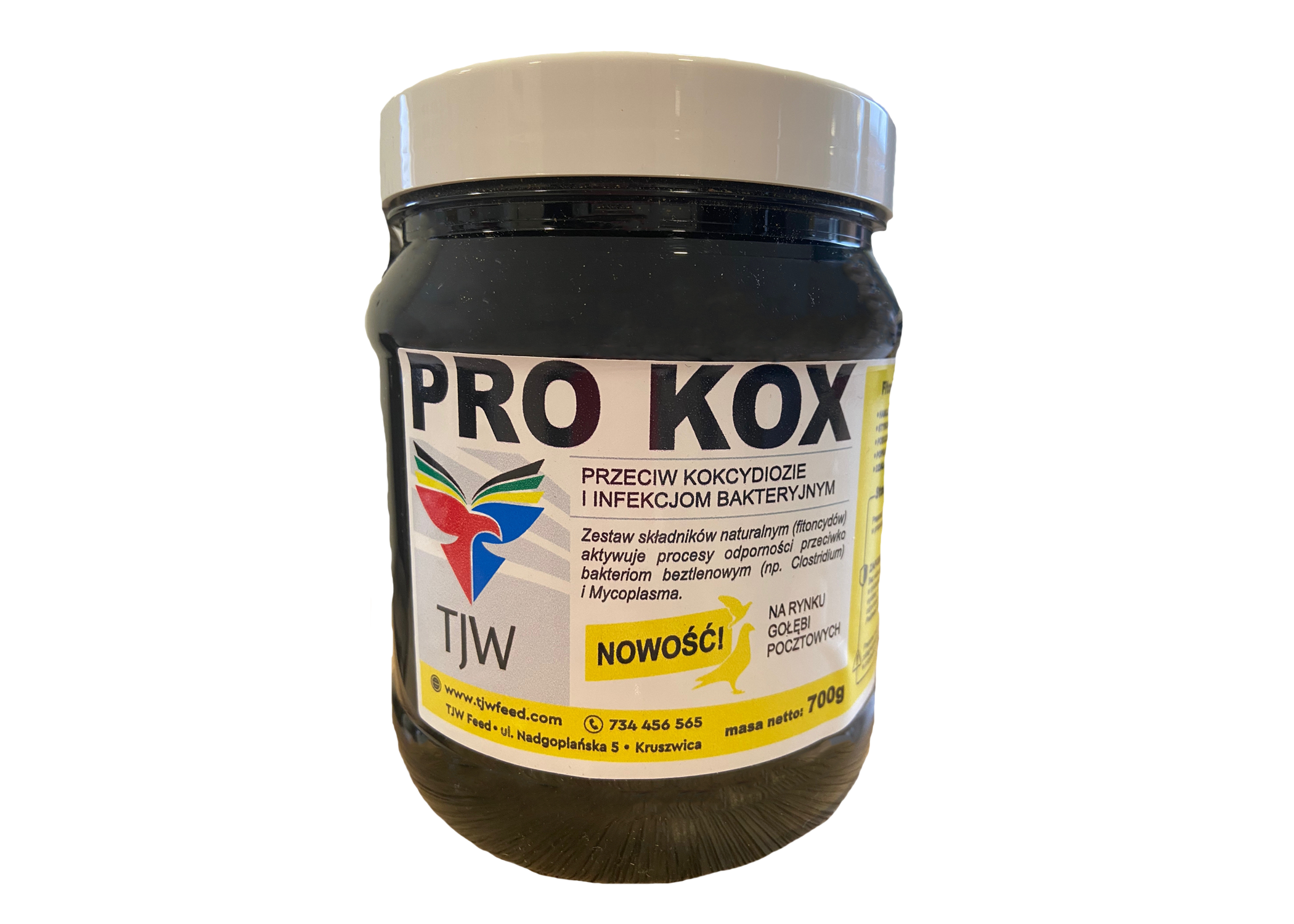 TJW ProKox 700g to innowacyjna formuła zawierająca naturalne składniki (fitoncydy), które aktywują procesy odpornościowe organizmu gołębi, zwalczając
